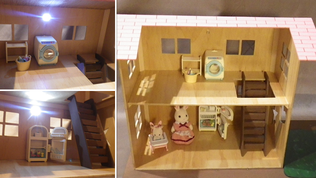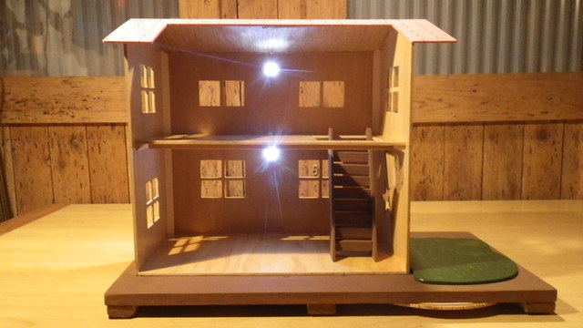 2階建てのシンプルな造りですが、手前側面の壁を開けて、屋根もカットして中を見やすくしています。実際に光るLED照明が雰囲気をUPしています。